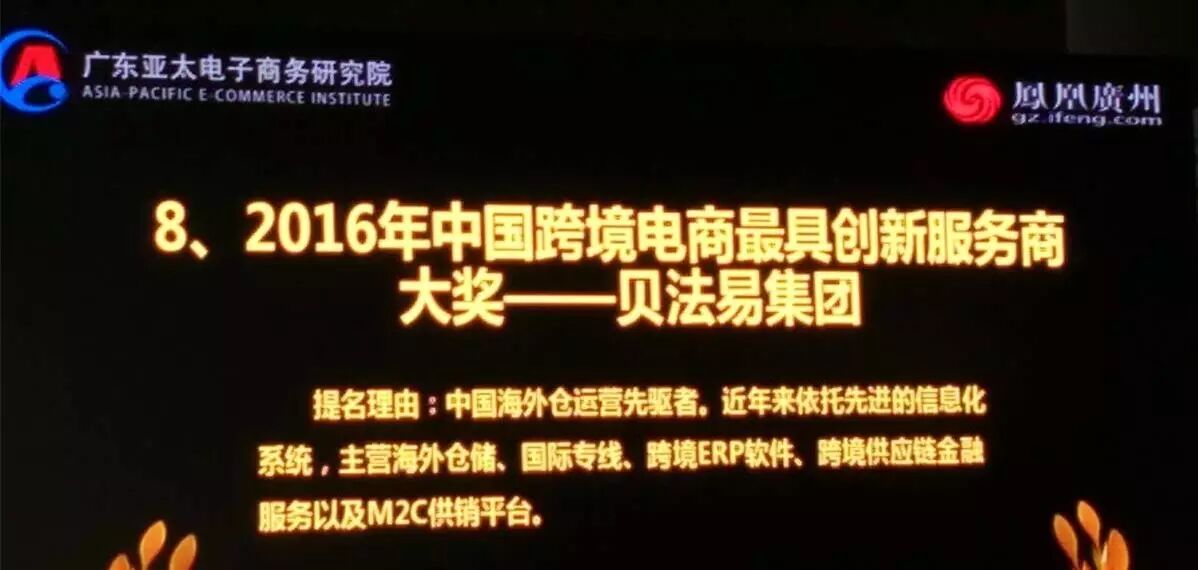 贝法易集团在大会中荣获2016 年中国跨境电商最具创新服务商大奖。中国国际中小企业博览会组委会、广东亚太电子商务研究院公布的获奖理由称:贝法易集团是中国海外仓运营先驱者。近年来依托先进的信息化系统,主营海外仓储、国际专线、跨境ERP 软件、跨境供应链金融服务以及M2C 供销平台。